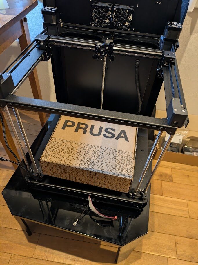 組み立て工程で興味深かったのは、空のダンボールをヒートベッドの上に置いて、部品落下による損傷を防ぐという指示です。