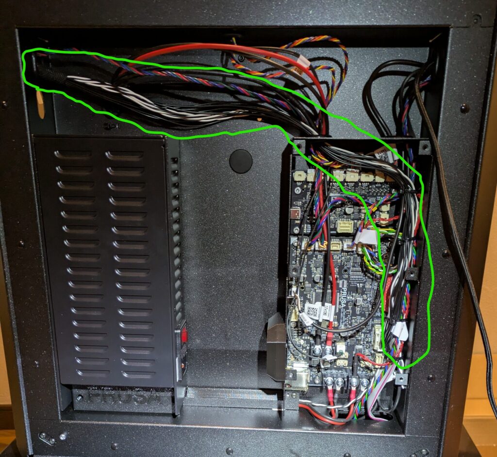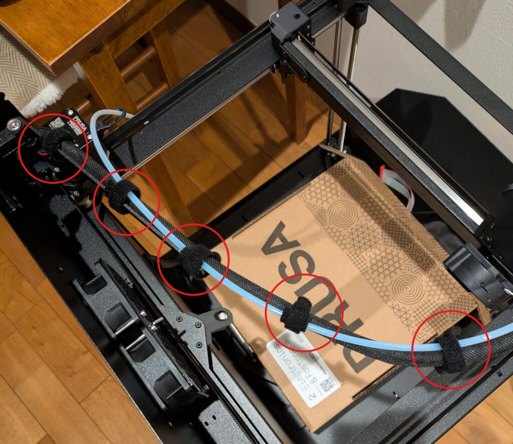 これが一番焦りました。全体の長さは足りているんです。ただ、マニュアル通りに組み付けるとエクストルーダー近辺のケーブルがたるみがちになり、メインボードまでコネクタが届きません。ケーブルを固定しているバンドやら部品やらをすべて緩め、ボードに届くまで長さを調整してやる必要がありました。これは手順の問題です。Prusaさん、ここは修正してほしいっす。