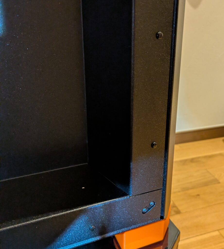 こちらは、ユーザーコメントを参考に六角レンチを使って位置を調整したり、リベットを入れる順番を中央付近から始めることで組み付けられました。最後の上二つがなかなか入らなくて、正直諦めようと思ったぐらい大変でした。パネルを少し手で押さえながら角度を調整し、リベットの先端が穴に入る位置を探るという、かなり根気のいる作業です。
